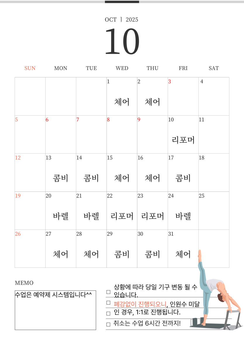 10월 강의계획표 페이지 정보 작성자 관리자 작성일 25-10-01 16:24 조회 9 댓글 0 본문 안녕하세요 필라테스 칼리지 안중점 입니다. 10월 강의계획표 업로드되었습니다 ~ ^^ 이전글 10월 시간표 다음글 9월 시간표 댓글목록 0 등록된 댓글이 없습니다.
