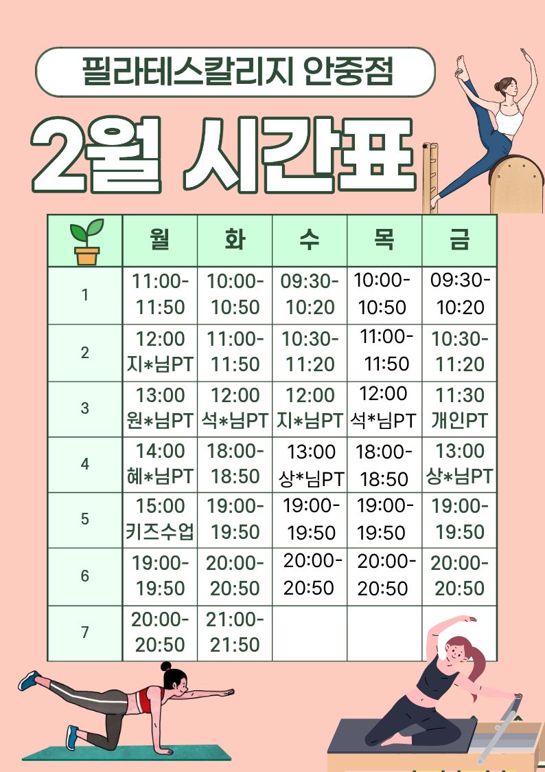 2월 시간표 페이지 정보 작성자 관리자 작성일 26-02-03 09:57 조회 6 댓글 0 본문 안녕하세요 필라테스 칼리지 안중점입니다. 2월시간표 업로드 하였으니 확인하시고 문의사항이 있으시면 연락주세요^^ 이전글 2월 강의계획표 다음글 2026년 1월 시간표 댓글목록 0 등록된 댓글이 없습니다.