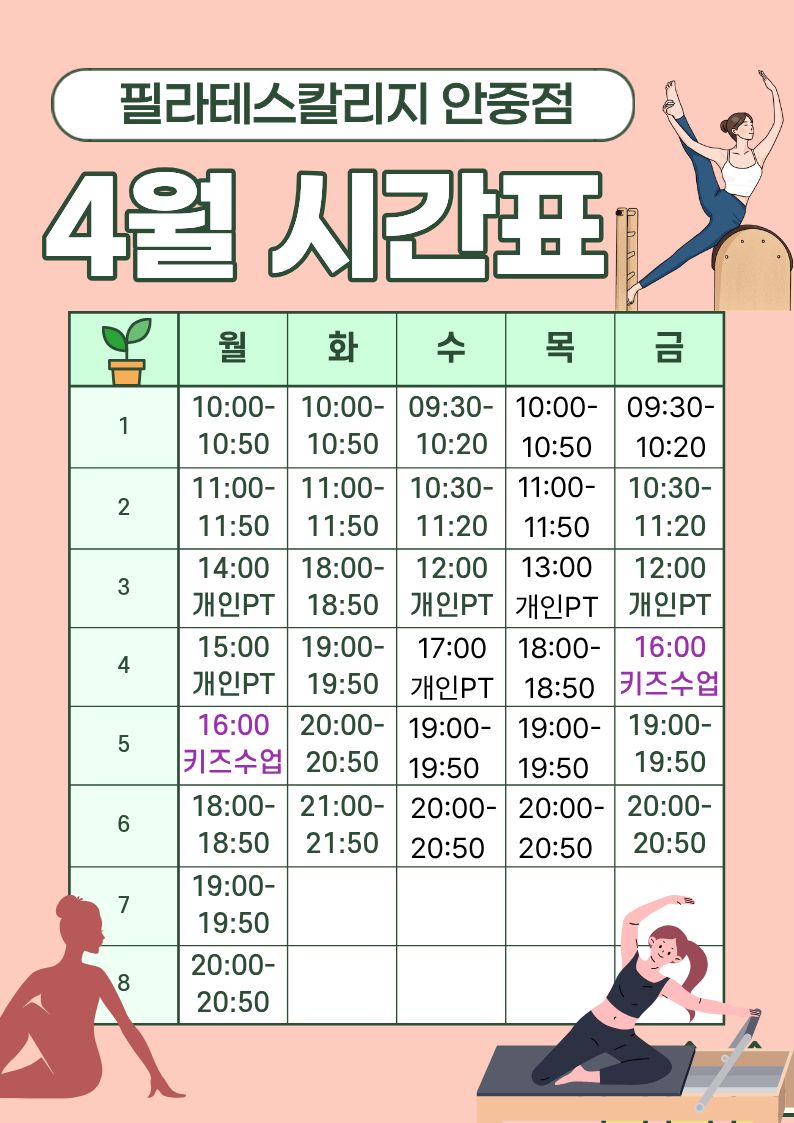 4월 시간표 페이지 정보 작성자 관리자 작성일 26-04-01 11:05 조회 5 댓글 0 본문 안녕하세요 필라테스칼리지 안중점입니다. :) 4월 시간표 업로드 되었으니 확인해주세요^^ 보시고 궁금하신 사항 있으시면 언제든 연락 바랍니다! 다음글 4월 기구 댓글목록 0 등록된 댓글이 없습니다.